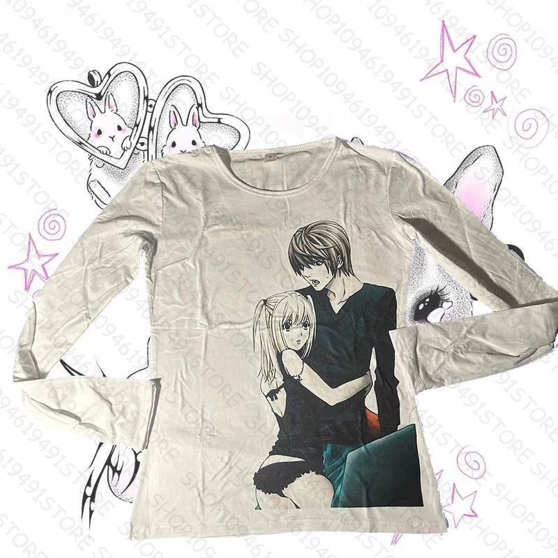 2000년대 그래픽 티셔츠 빈티지 페어리 그런지 여성 가을 레이스 트림 긴팔 슬림핏 탑 y2k 의류 기본 하라주쿠 티셔츠