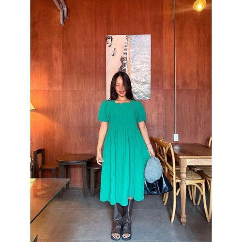 [샵앤][샵앤] 스모크밴딩 라운드 퍼프소매 데일리 여성 반팔 롱원피스 RC-WDR-11994-그린