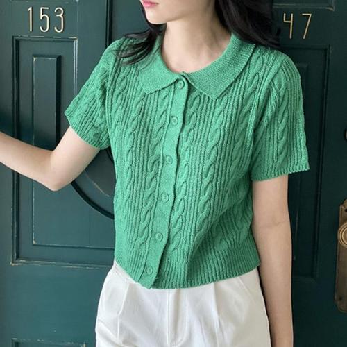 여자 여름 그린 꽈배기 카라 단추 크롭 니트