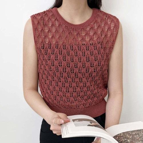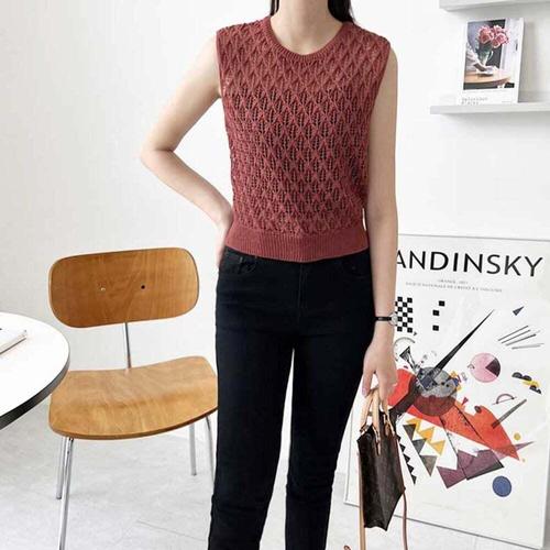 펀칭 민소매 니트 조끼 여성용 여름 루즈핏 레이어드 날씬해 시원한 라운드넥 얇은 데일리 티셔츠