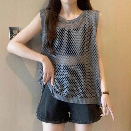 여성 조끼 니트 펀칭 그물 크롭 데일리 여름 (WFHQHMP)