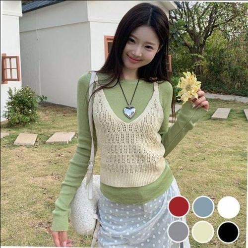 [에이치플러스몰]레이어드 그물 추천 크롭 기장 꾸안꾸 펀칭 니트 조끼