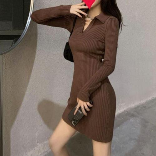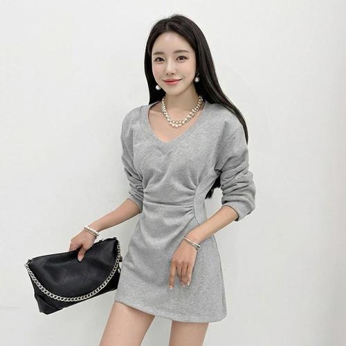 [라일리여성의류] Rly 글램 슬림핏 여자 V넥 미니 원피스 긴팔 카라