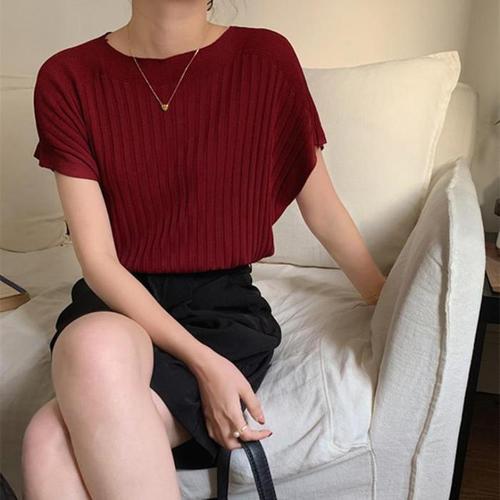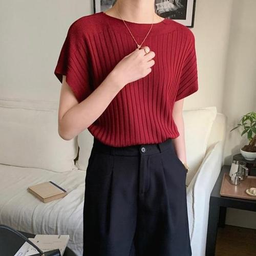 [다잇템]여성 베이직 기모노핏 반소매 세로골지 니트 (41007005A)