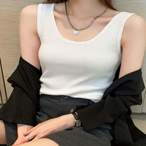 여성 쫀쫀한 배색 티셔츠 신축성 기본 이너 레이어드 나시