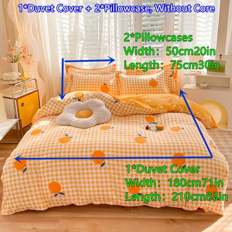 TEMU 폴리에스터 프린트 대형 오렌지색 이불 커버 세트 3개, 과일 프린트, 체크무늬 프린트, 침실용 스위트 1개의 이불 + 2개의 베갯잇