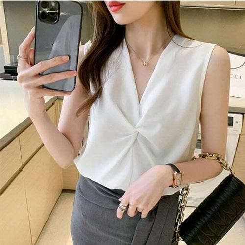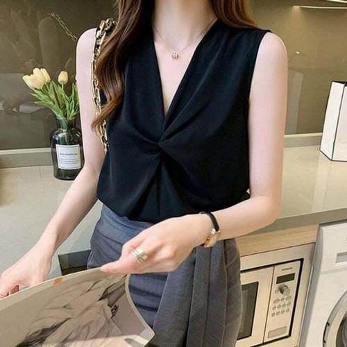 [셀럽하우스]블라우스 FUFW7599 앞 깔끔 부드러운소재 민소매 꼬임 포인트