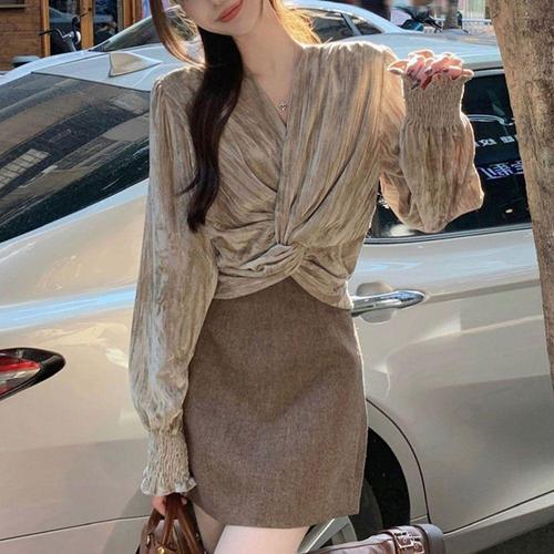[셀럽하우스]꼬임 GGAV8531 크롭 블라우스 브이넥 랩 st 어깨