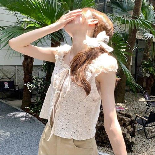 [다잇템]여자 꽃자수 펀칭 반소매 리본 크림색 블라우스
