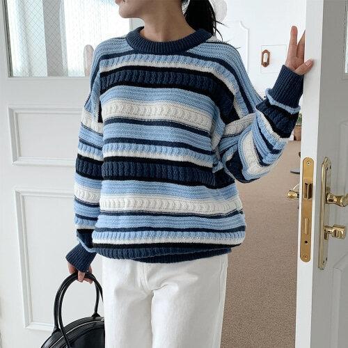 [굿쇼핑몰_의류]2컬러 루즈핏 스트라이프 배색 긴팔 꽈배기 니트