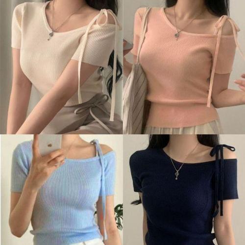 레이디스 언밸런스 오픈숄더 올데이 리본끈 썸머숏슬리브 뜨개탑
