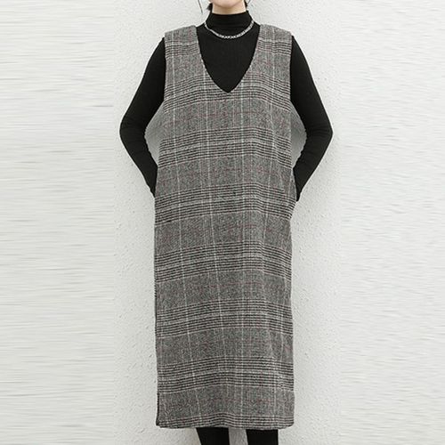 나바바 / NO961 여성 캐주얼 체크 브이넥 민소매 원피스