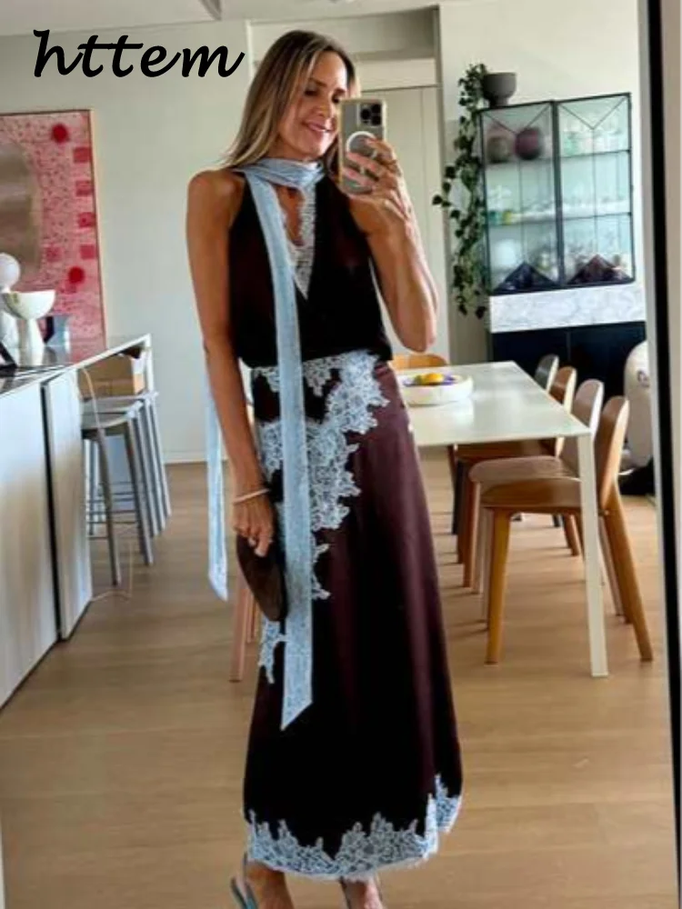 우아한 레이스 배색 롱 스커트 세트 여성용 홀터 슬리브리스 백리스 탑 스트레이트 스커트 2025 가을 여성 정장