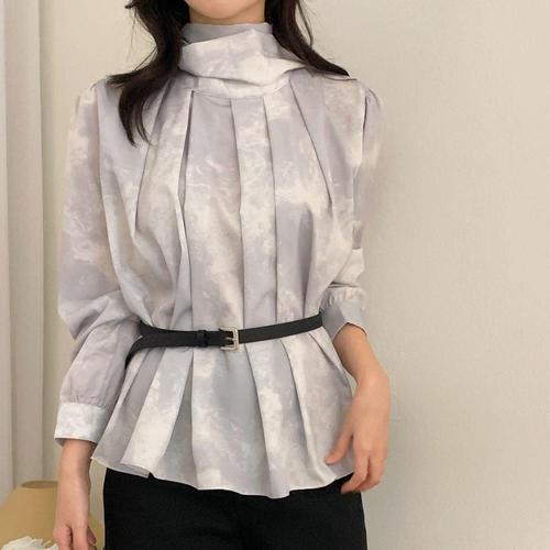 [옷자락] 여자 하객룩 플리츠 물나염 롱타이 퍼프 블라우스