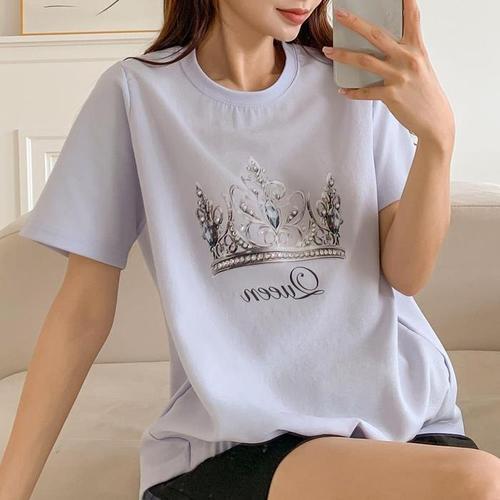 [다잇템]여성 필기체 고무줄 나염 박스핏 왕관 티셔츠 (16138276)