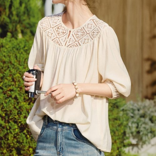 여성 레이스 자수 블라우스 펀칭 셔링 반팔 티셔츠 여름 데일리 루즈핏 캐주얼 셔츠 소매 라운드넥