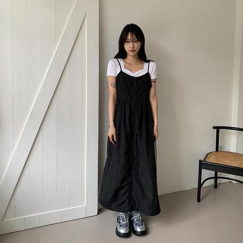 [다잇템]여자 민무늬 티어드 벨티드 나일론 롱원피스 (12291232A)