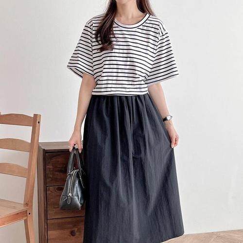 [다잇템]여자 줄무늬 콘트라스트 나일론 박스 롱원피스 (15728112A)