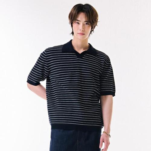 [체이스컬트][본사]남성 쿨 터치 스트라이프 오픈카라넥 반팔 스웨터-DBRK5612D0A