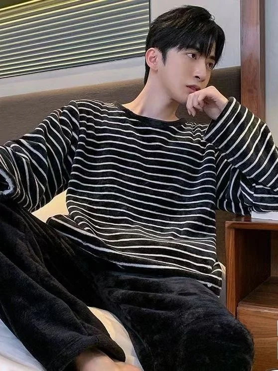 한국 스타일 INS 스트라이프 플란넬 잠옷 남성용 가을 겨울 코랄 벨벳 얇은 특대 사이즈 플리스 안감 홈웨어