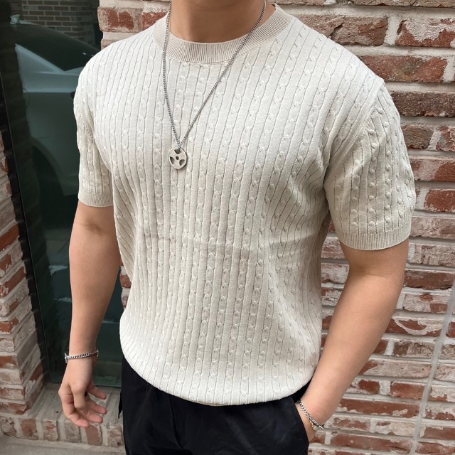 Destijl HC06 깔끔한 비즈배색 모브 라운드 5부반팔 벌집 니트티 D2621sw06