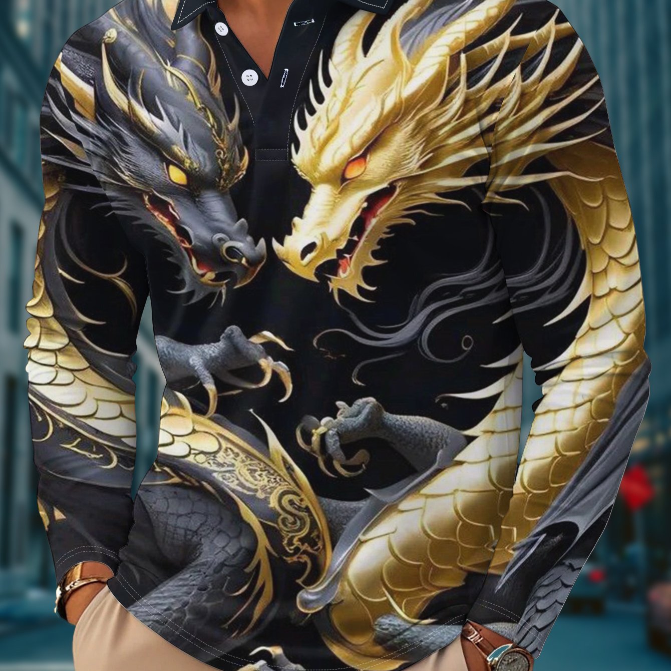 TEMU 남성용 미식 드래곤 프린트 골프 셔츠, 캐주얼 스타일 롱슬리브 상의 선물로