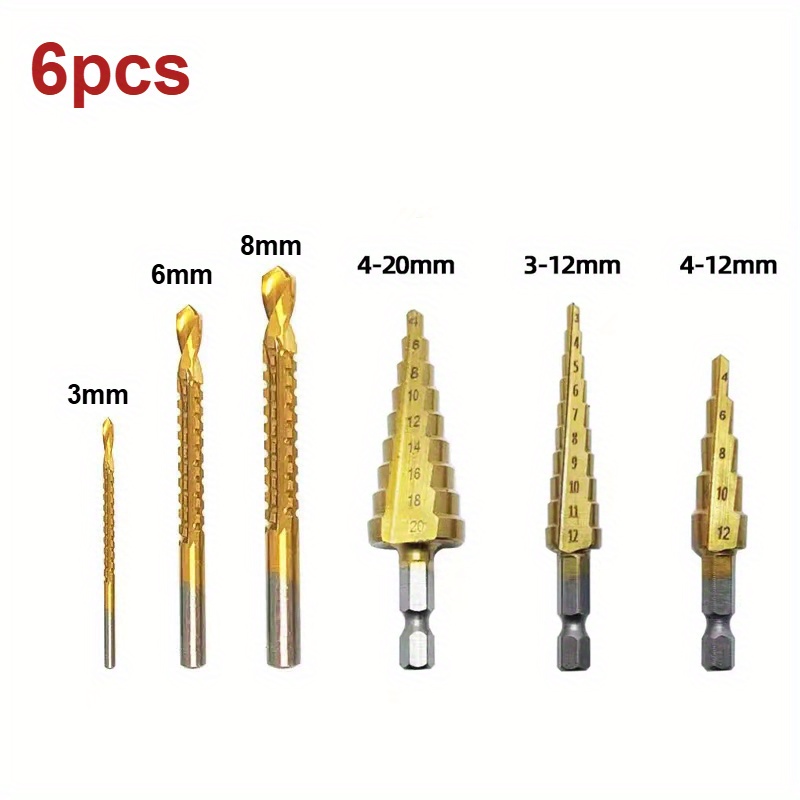 TEMU 6pcs 스텝 드릴 비트 세트, 티타늄 크롬 주철 커터 4 4-12 3-12mm 3 6 8mm, 목공 및 금속 코어 드릴링용