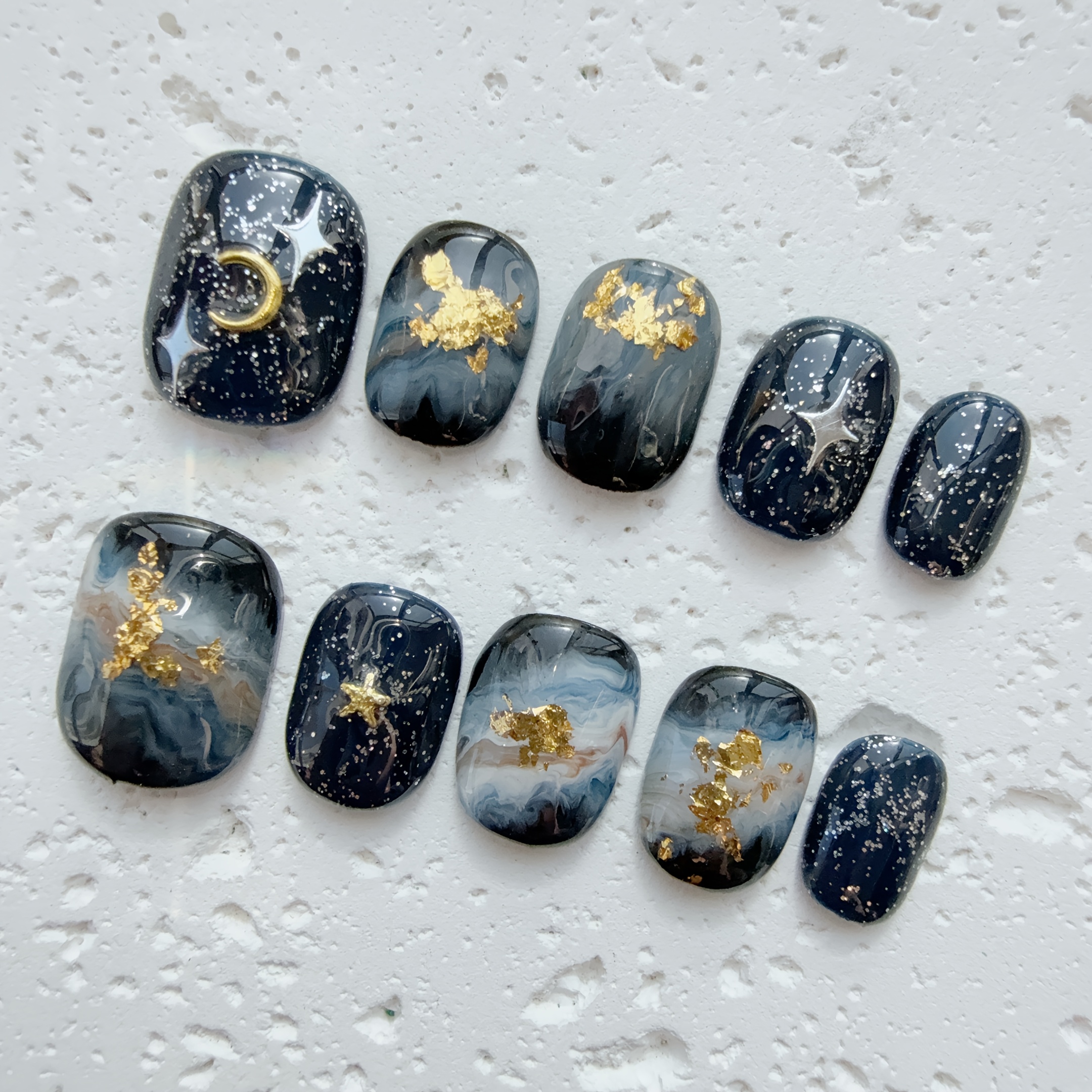 TEMU 10개 럭셔리 핸드메이드 프레스온 네일 세트 - 광택 있는 블랙과 골드 호일 악센트, 우아한 매니큐어를 위한 짧은 타원형