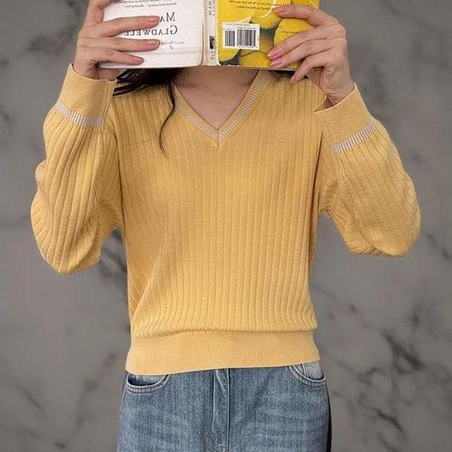 [옷자락] 여성 배색 V넥 가을 골지 니트 노랑 버건디 니트