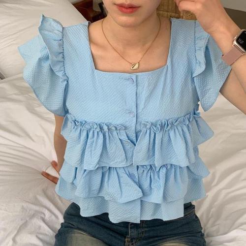 [브이와이][VY] 여자 노랑 프릴 캉캉블라우스 시어서커 귀여운 블라우스_17190124_588847