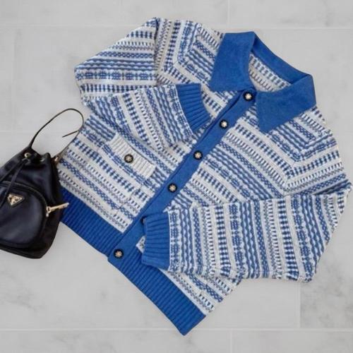 [옷자락]여성 캐주얼 노르딕 스트라이프 버튼 카라넥 니트 가디건