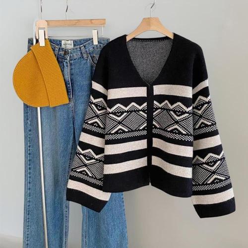 [하프클럽/]여자 배색 노르딕 패턴 카라넥 단가라 부클니트 가디건