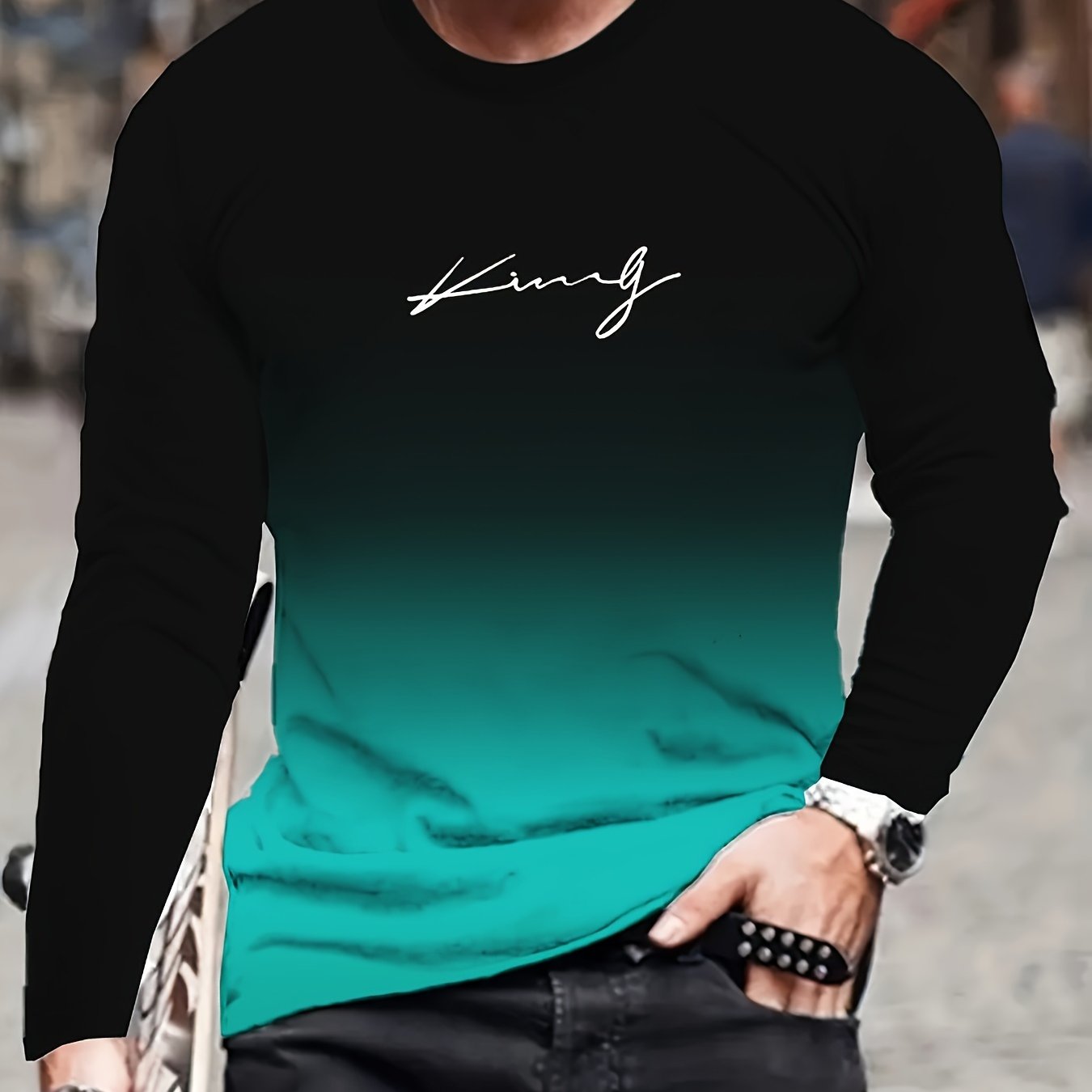 TEMU 남성용 "KING" 그라데이션 긴팔 티셔츠 - 캐주얼 & 스포티, 라운드 넥, 100% 폴리에스테르 - 가을/겨울에 완벽, 세탁기 사용 가능