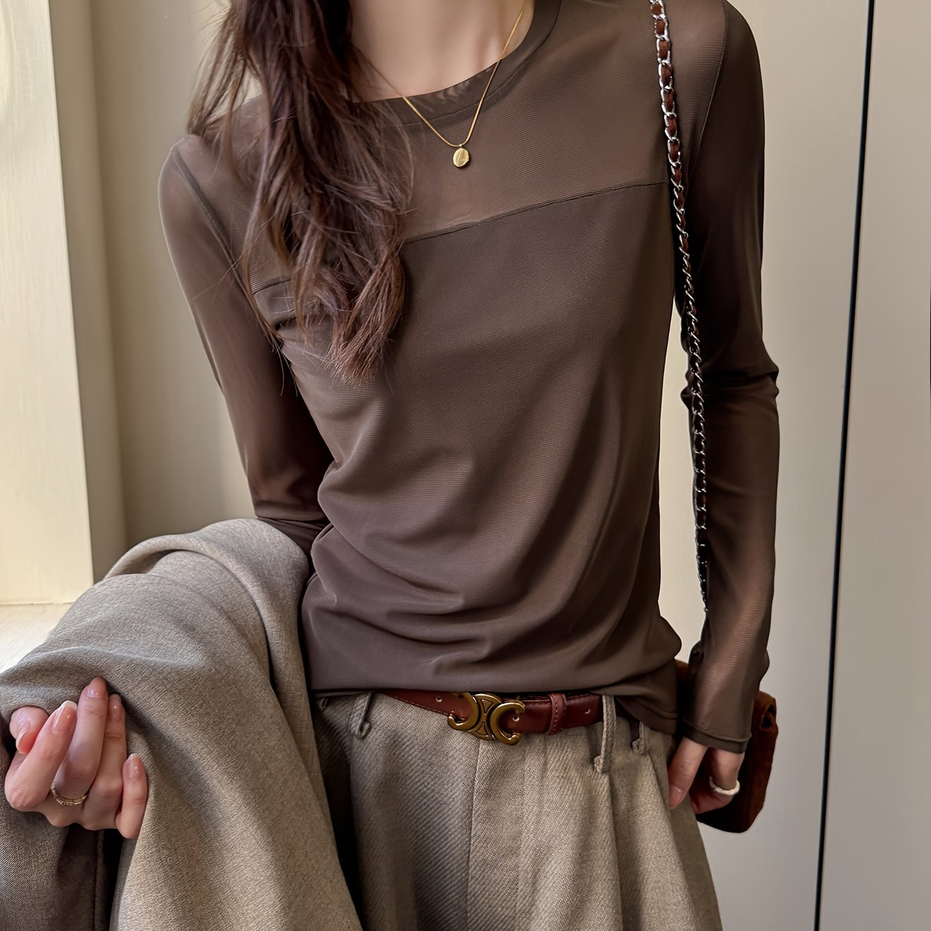 TEMU 여성용 코리안 스타일 쉬어 메쉬 패널 긴팔 티셔츠 - 슬림핏 세미 쉬어 블라우스 (화이트 베이스 & 네트 백), 봄 여름 가을용 통기성 레이어드 탑 / 코리안 패션 (캐주얼/오피스 웨어) - 기계 세탁 가능 스트레치