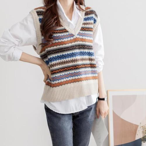 [다잇템]여자 스웨터 패턴 뉴트로 인디고 조끼_4 (41374540A)
