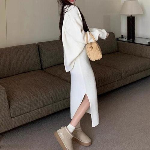 시연 가을 겨울 후드 골지 니트 롱 원피스 스웨터 스커트