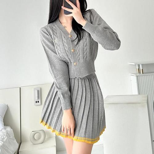 배색 니트 여성 셋업 플리츠 카라 세트 스커트