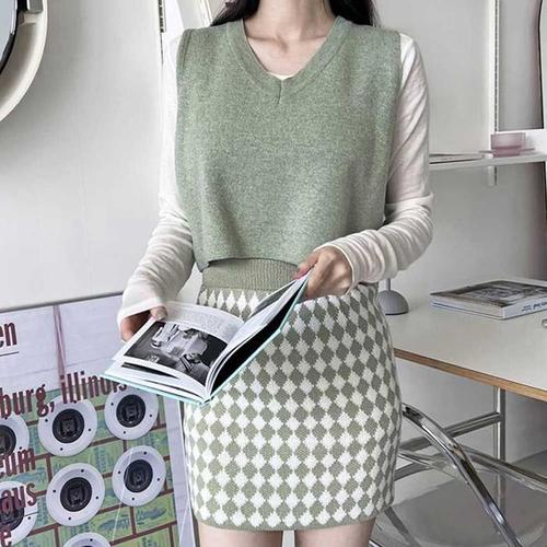 [주식회사 브이와이][JHQRJKW7_4B]니트 조끼 꽈배기니트세트 스커트 크롭 (24153472A)