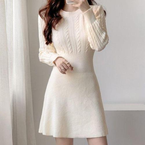 슬림 여성스러운 플레어 니트 넥라운드 미니 원피스