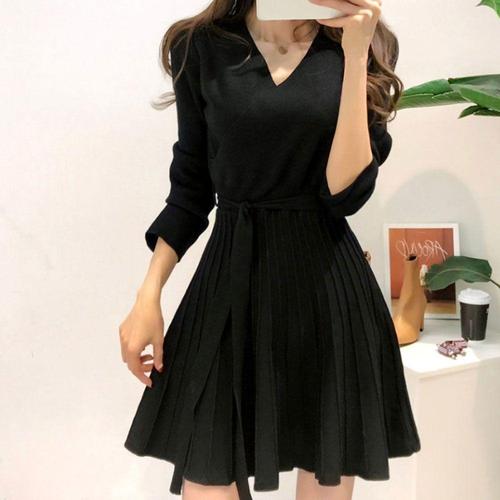 [셀럽하우스]미니원피스 XKKL9537 니트 라인 플레어 상의 골지 긴팔 원피스