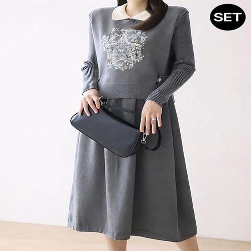 [모리스커밍홈]자수포인트 조끼 카라 니트 원피스 2종세트_M2602SE003A