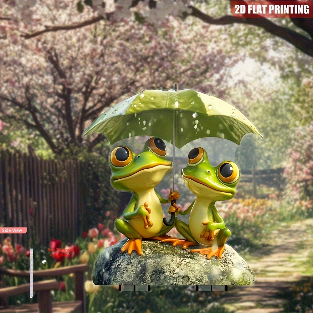 TEMU 2D 플랫 - 정원용 막대에 우산을 든 플라스틱 개구리 한 쌍이 특징인 2D 플랫 디자인 - 내후성 야외 장식, 생생한 녹색 개구리 디자인, 그리고 앞마당을 위한 튼튼한 접지 막대.