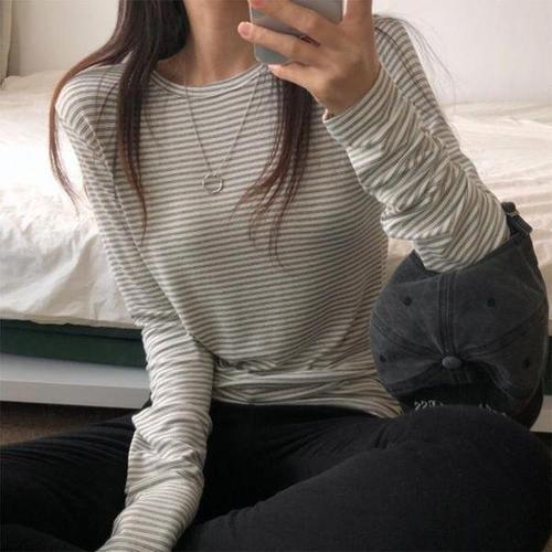 [셀러허브_여성트랜드패션]여자 편한 라운드 클래식 단가라 긴팔티 티셔츠