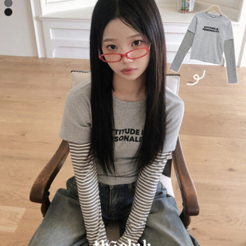 더핑크 / 차울 반팔 레이어드 프린팅 스트라이프 긴팔티