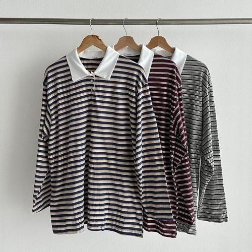 [모코블링]멀티 스트라이프 카라 티셔츠 긴팔티 카라티 슬릿티 럭비티 스트라이프티