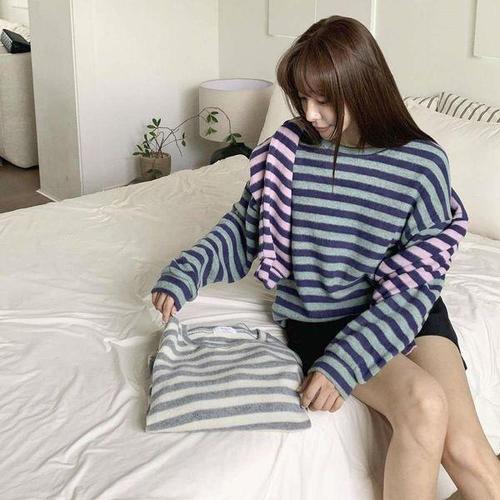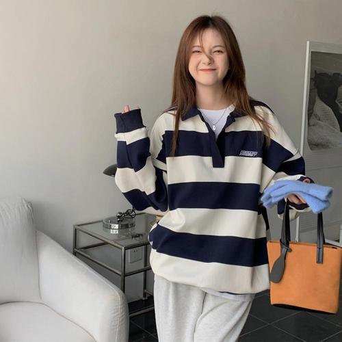 크레스티 여성 스트라이프 캐주얼 맨투맨 가을 겨울 루즈핏 도톰 라운드 맨투맨