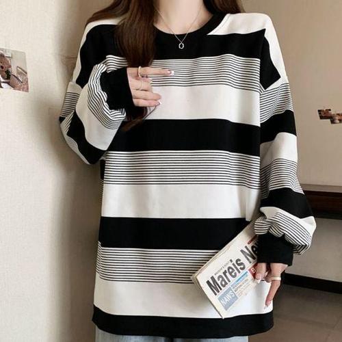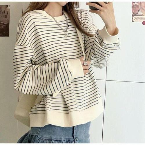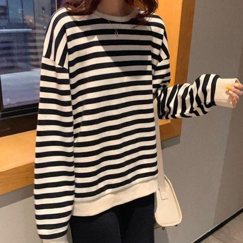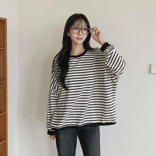 [신상오픈런]여성 데일리 루즈핏 면혼방 스트라이프 긴팔 맨투맨