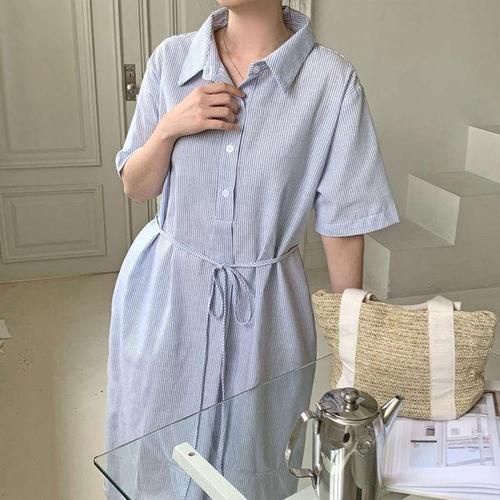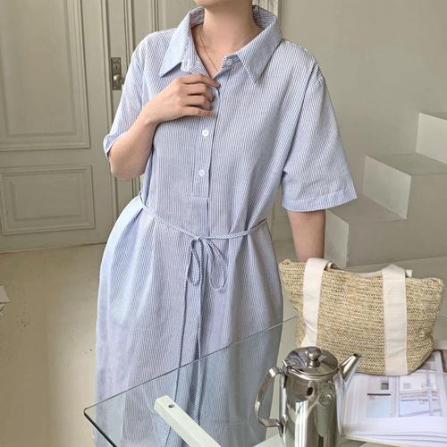 [옷자락] 여성 클래식 면혼방 스트라이프 허리끈 반팔 롱 원피스