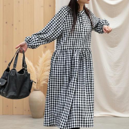 [옷자락]여성 체크 패턴 롱 코튼 원피스 봄용 빅사이즈