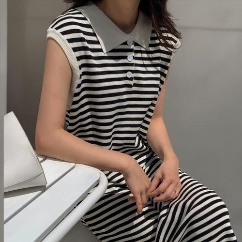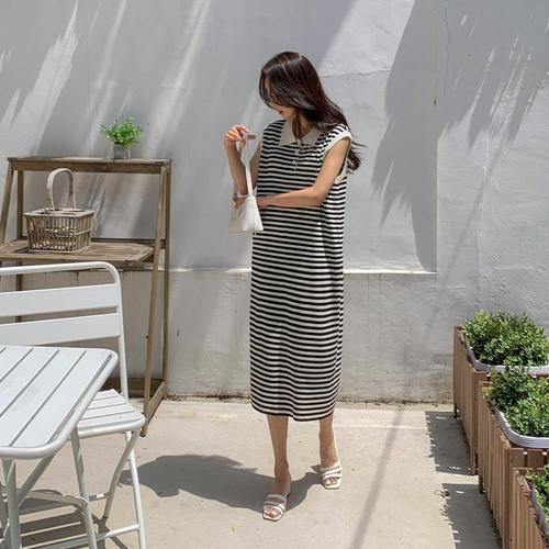 [옷자락] 여성 면혼합 스트라이프 카라 넥 민소매 롱 드레스